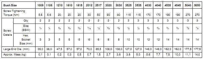 - Using a hammer and block, or sleeve, against the large end of the Taper Lock bush will help to avoid damage to the bushing. Lightly tap against the busing to ensure it is seated squarely. The screws are then tightened further. A torque wrench is used to tighten the screws alternatively and evenly until they are all to the recommended torque setting. This information is available from the installation sheet that accompanies any new Taper Lock bush. See example chart below (figure 3), or ask for this information at any CBC office.