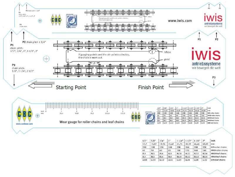 Many industrial chain manufacturers’ and CBC provide an easy to read and use “Wear Gauge Ruler”. This simple tool facilitates measurement checks for excessive chain wear. The chain “Wear Gauge Ruler” can be used on all industrial roller chain and leaf chains. This Wear Gauge Ruler has already considered and includes the 3% elongation formulae measurement for each industrial roller and leaf chains.